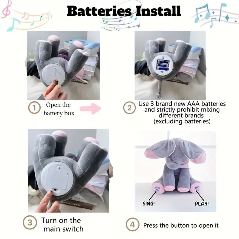 - Način rada: glavni prekidač ispod slona za uključivanje; dugme „PLAY“ (desna noga) za igru skrivanja; dugme „SING“ (leva noga) za pesmu.