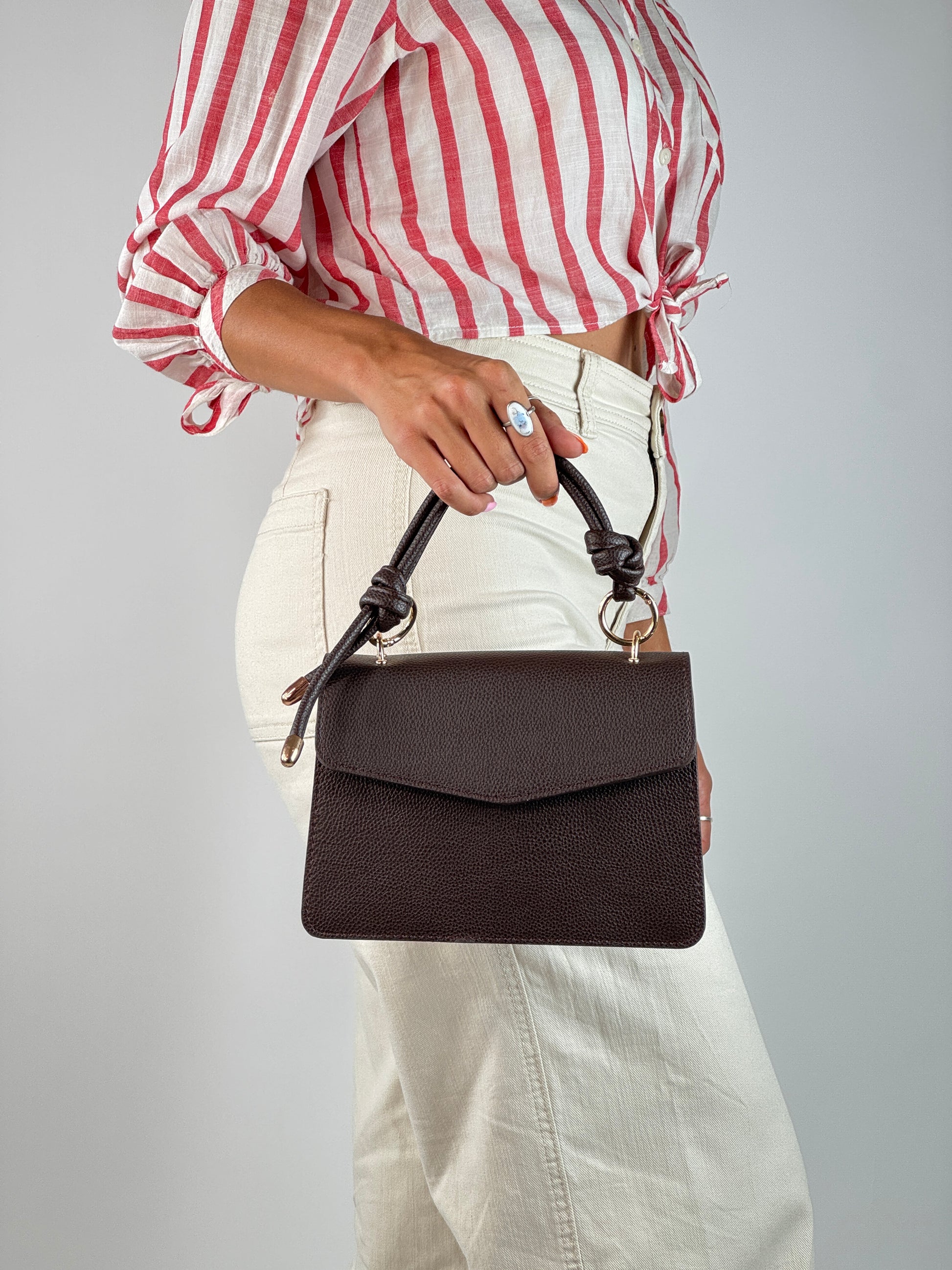 Torbica Aria odiše elegancijom i svestranošću. Tamno braon boja u kombinaciji sa teksturom eko kože i detaljima u zlatnoj nijansi čini je savršenim dodatkom uz dnevne i večernje kombinacije. Stilizovani čvorovi na kaiševima dodaju joj unikatni karakter.