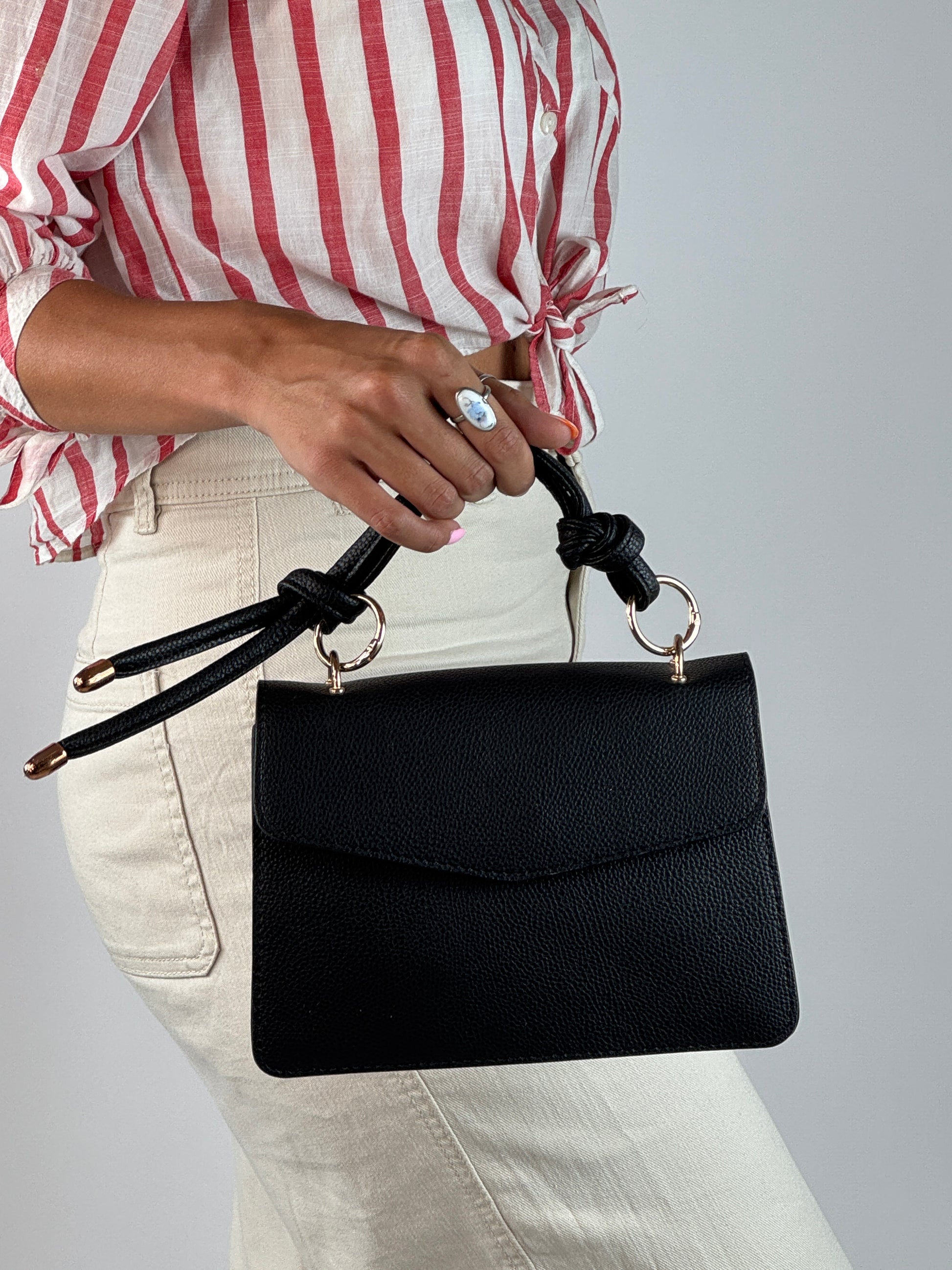 Torbica Aria u crnoj boji donosi savršen balans između klasike i modernih detalja. Teksturirana eko koža, zlatni metalni elementi i ručno vezani čvorovi na kaiševima čine je svestranim komadom koji lako ide uz sve – od poslovnih kombinacija do večernjeg izlaska.
